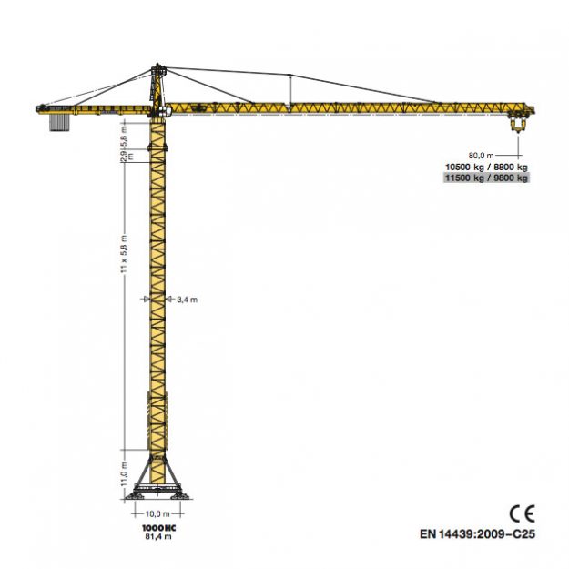 1000 EC-H Liebherr, modelo 1000 EC-H , 80 metros de flecha 10.500kg en punta ,20.000kg de máxima . posibilidad de base, altura estable hasta 51,0 metros .