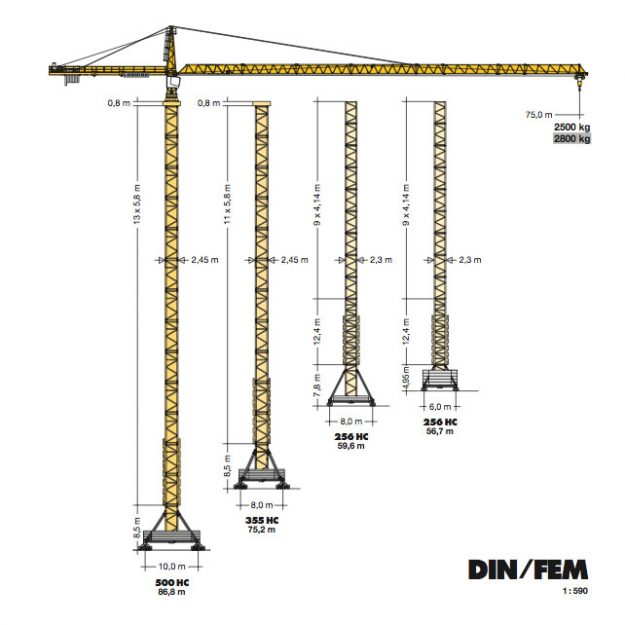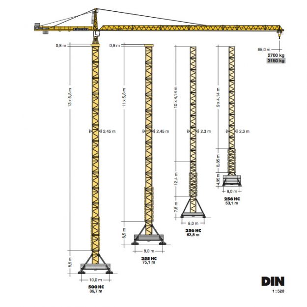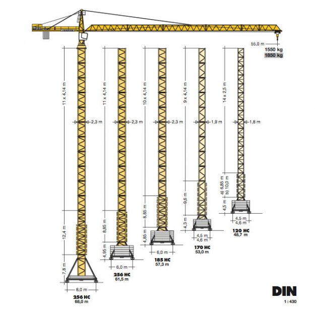 550 EC-H Liebherr, modelo 550 EC-H , 81,5 metros de flecha 4.000 kg en punta ,12.000kg de máxima . posibilidad de base, altura estable hasta 78 metros .