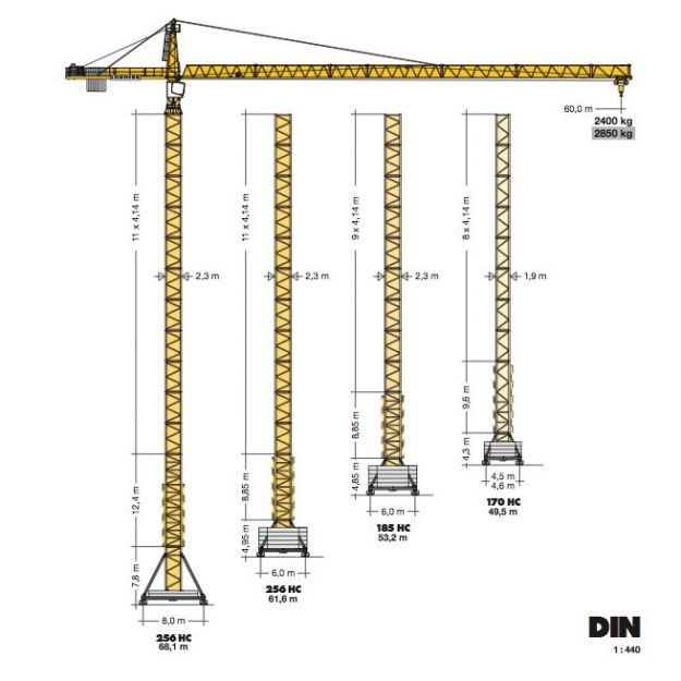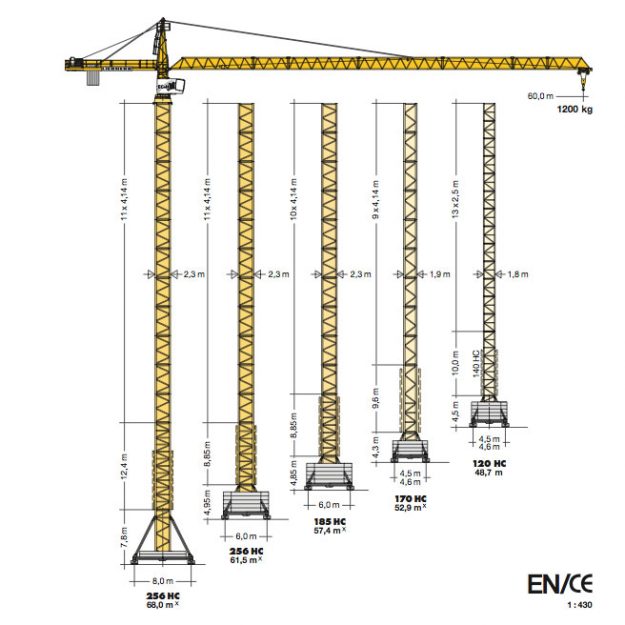 200 EC-H Liebherr, modelo 200 EC-H , 60 metros de flecha 2.400 kg en punta ,10.000kg de máxima . posibilidad de base, altura estable hasta 64,6 metros .
