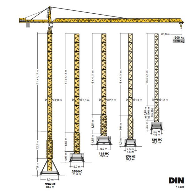 140 EC-H Liebherr, modelo 140 EC-H , 60 metros de flecha 1.600 kg en punta ,6.000kg de máxima . posibilidad de base, altura estable hasta 43,8 metros .